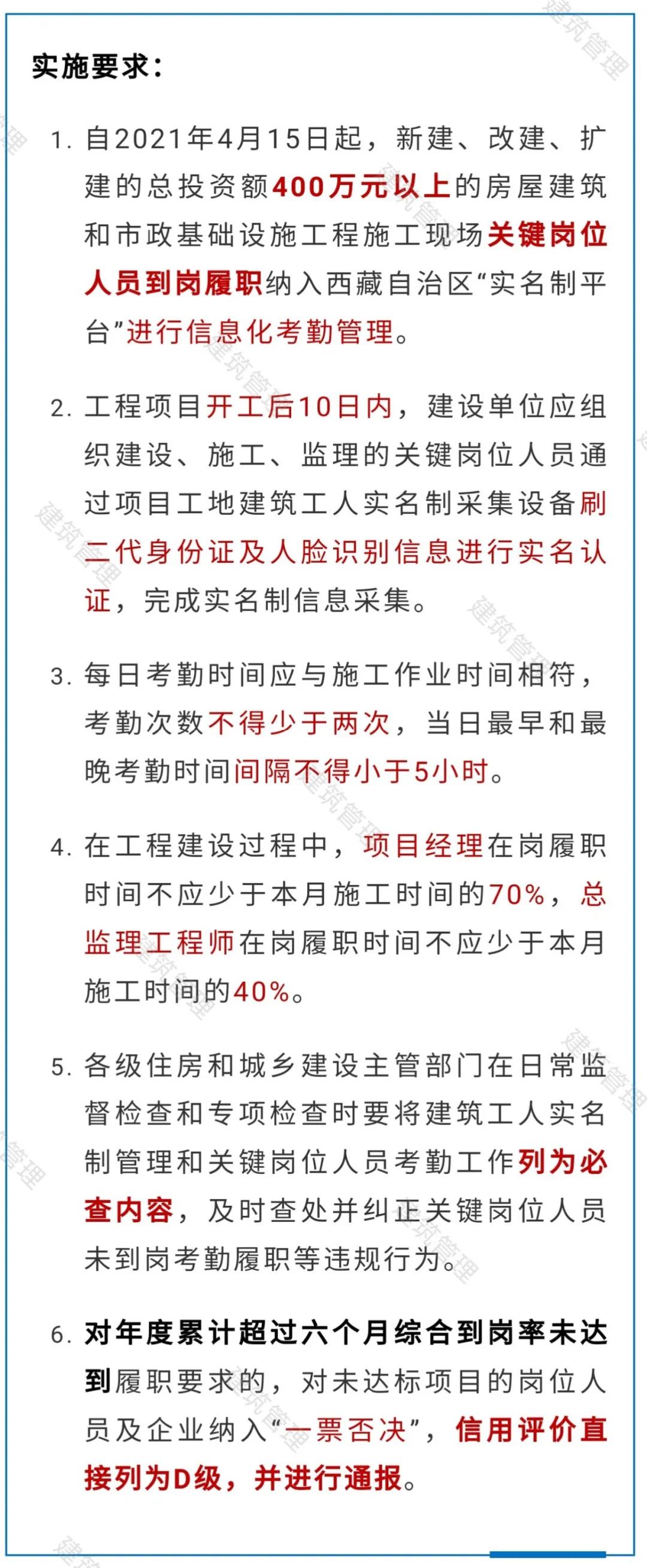自2021年4月15日起,凡在我區(qū)行政區(qū)劃內(nèi)新建、改建、擴(kuò)建的總投資額400萬(wàn)元以上的房屋建筑和市政基礎(chǔ)設(shè)施工程施工現(xiàn)場(chǎng)關(guān)鍵崗位人員到崗履職納入“西藏自治區(qū)建筑工人實(shí)名制管理平臺(tái)”(以下簡(jiǎn)稱(chēng)“實(shí)名制平臺(tái)”)進(jìn)行信息化考勤管理。