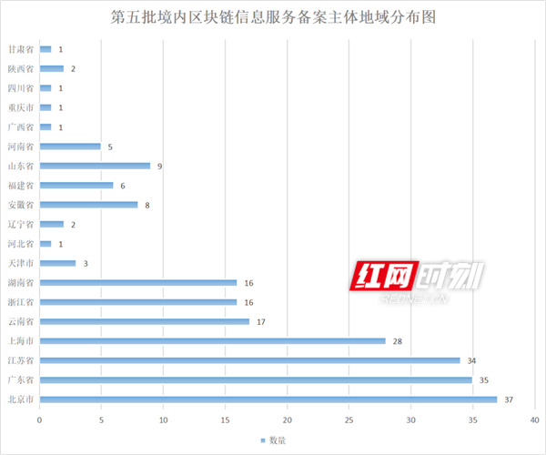 全國第五批境內(nèi)區(qū)塊鏈信息服務(wù)備案主體地域分布圖。